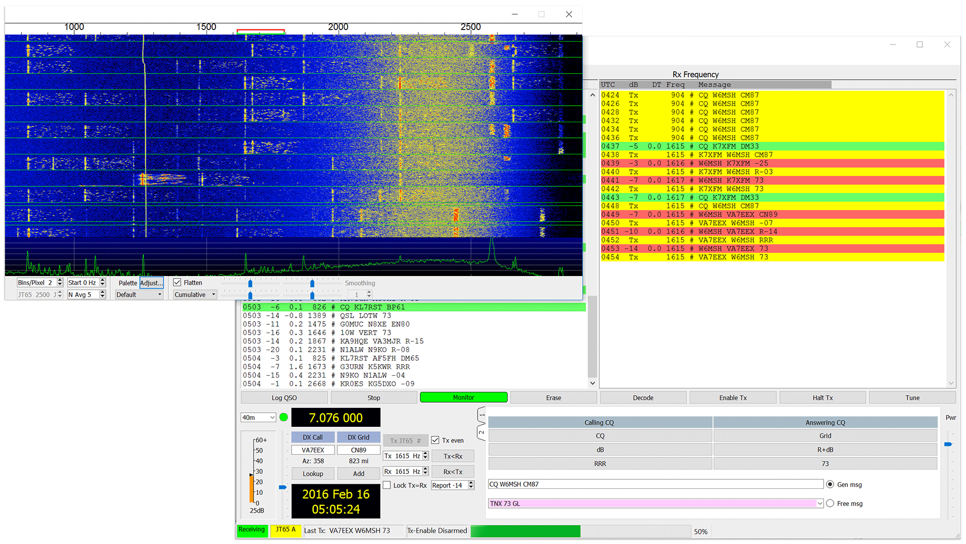 Here is a screen shot of some JT65 activity, including two contacts (listed on the right).